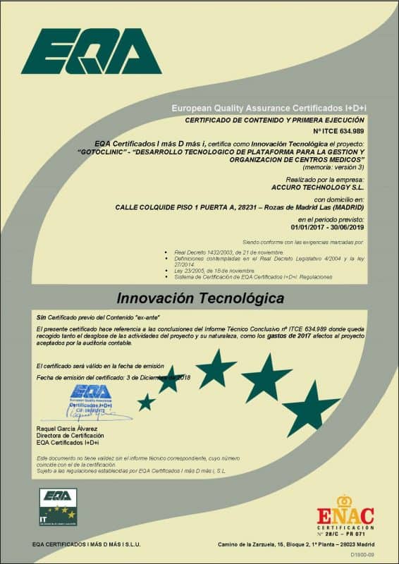 El producto de Gestion y Organizacion de Centros Medicos GoToClinics de ACCURO TECHNOLOGY ha sido certificado como Innovación Tecnologica. Gestion y Organizacion de Centros Medicos A día de hoy además de la gestión de citas convencionales sea necesario dar a los clientes la posibilidad de poder pedir dichas citas también a través de internet, de […]